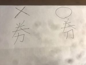 次によくあったのが、「券」。「有価証券」等でよく書く漢字。こちらは「刀」を「力」と書いてしまう人が多かった。すこし突き抜けるくらいなら〇と言われており、明らかに力と書いていたら×とのことでした。